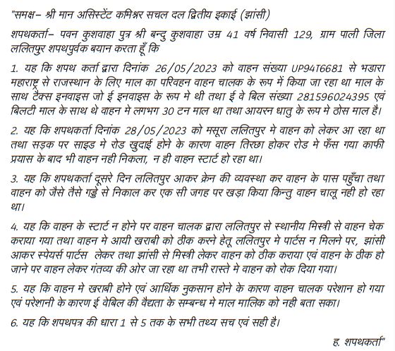 9. Admittedly, the goods in question were moved from Maharastra to Rajasthan via U.P. and the goods in question were accompanying with e-tax invoice, G.R. and e-way bill valid up to 1.6.2023. It has been averred that the vehicle in question was struck in mud on the road side due to heavy load of consignment and with the help of crane the same could be pulled out and thereafter when the vehicle engine could not start the driver contacted the mechanic for removing the defect / breakdown but as some spare parts were not available in local market of Lalitpur, the driver went to Jhansi for purchase of spare parts and thereafter the vehicle could be repaired within two days. On the intervening night of 2/3.6.2023 at 1.04 A.M. the vehicle was intercepted and show cause notice was issued on the ground that the e-way bill accompanying with the goods in question, was expired on 1.6.2023. Thereafter, the petitioner had replied the show cause notice annexing the affidavit of driver. The relevant part of the explanation given by the driver is quoted hereunder :-