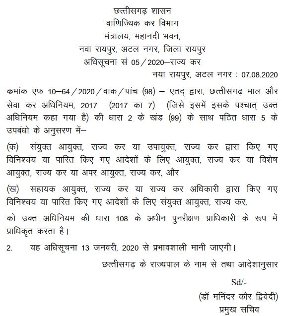 6. Perusal of the impugned order dated 01.06.2019 (Annexure-P/1) and Notification dated 07.08.2020 would show that though the concerned Authority has passed the order, however, on the date of passing of such order, no notification was issued enabling the said Authority to pass such order. The Notification was issued on 07.08.2020, whereby, the concerned Officers were authorized as Revisional Authority. The said Notification was issued by virtue of sub section (2) of Section 99 read with Section 5 of the Act 2017 which is reproduced hereunder:-