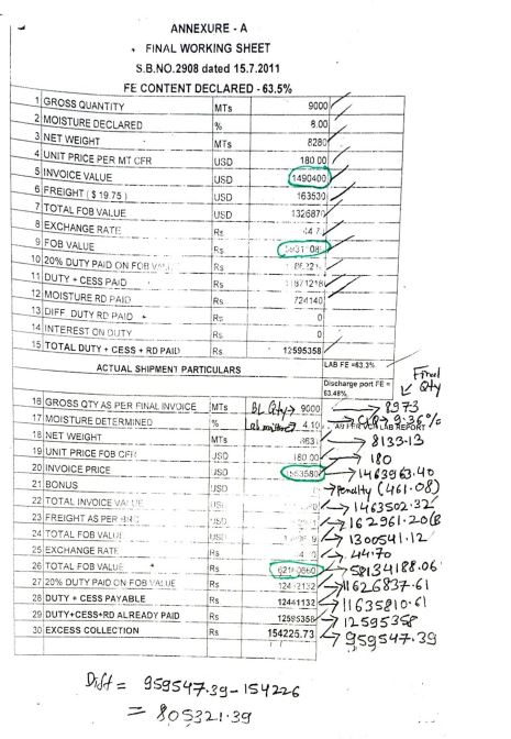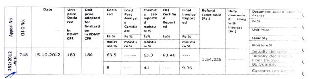 11. Therefore, in all these cases, the contracts are clearly specifying these parameters. From the documentary evidence provided by way of invoices, it is seen that based on the moisture content arrived at by CIQ, the appellant has reduced the quantity and arrived at the DMT quantity. There is no dispute that the appellant has realised only the value shown in the total value shown in the invoices. Therefore, it is clear that the transaction value has been followed by the appellant. This also meets the requirement as specified in the Circular No. 12/2014 dated 17.11.2014. Hence on this count the Appeal stands allowed.