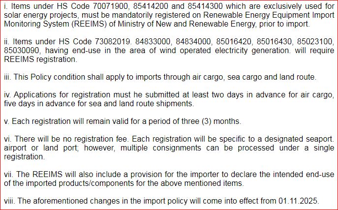 18. If the importer, at the time of import, is registered with the Indian Renewable Energy Development Agency or any State Nodal Agency notified for the purpose by the Ministry of New and Renewable Energy (MNRE), Government of India, for Central Financial Assistance. (Vide:- Notification No.45/2025-Condition No- 72)